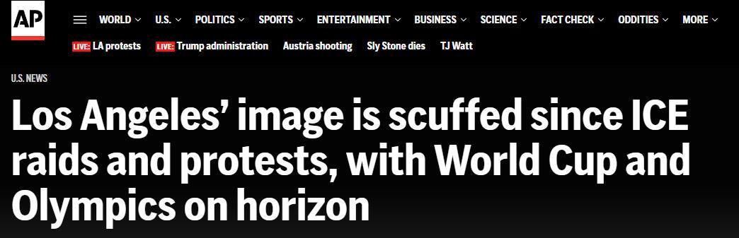 △美联社6月10日发表题为《自骚乱发生以来,洛杉矶的形象大打折扣,然而世界杯与奥运会即将到来》的文章。