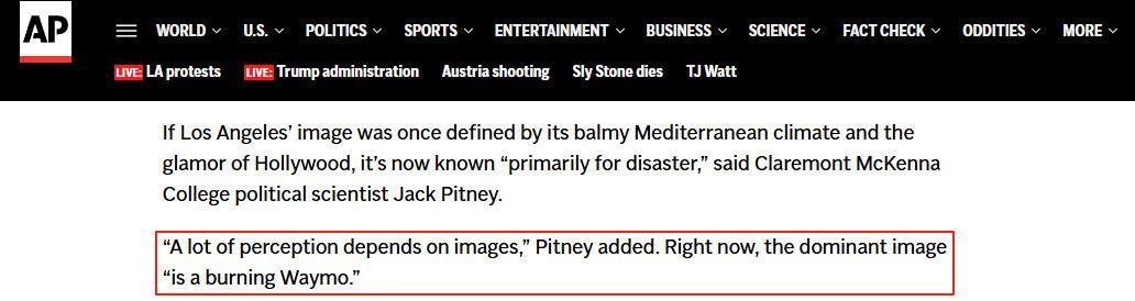 很多感知都取决于图像,但目前有关洛杉矶市的主流印象,都是一张张燃烧的无人驾驶出租车的图片。”