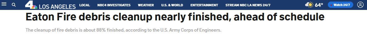 △美国全国广播公司:伊顿山火废墟清理接近完成,比计划更早