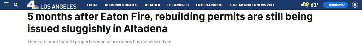 △美国全国广播公司:伊顿山火爆发5个月后,阿尔塔迪纳的重建许可证发放仍然缓慢