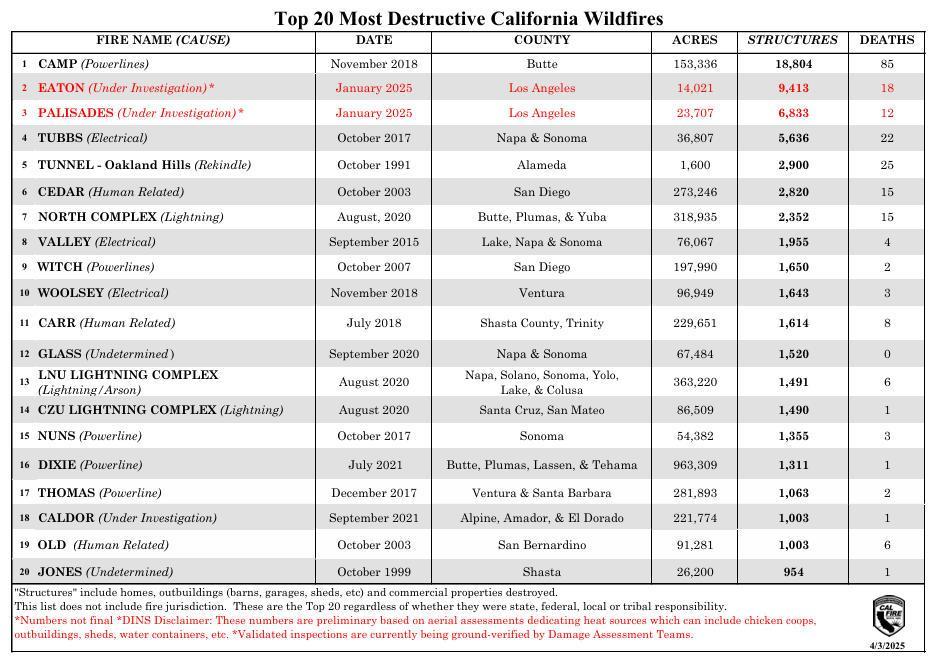 根据美国加州林业和消防局的统计,本次在洛杉矶发生的山火中的两起——伊顿山火和帕利塞德山火,分别列入加州历史上最严重的20起山火中的第二位与第三位。截至4月3日,死于这两起严重山火的遇难者人数已升至30人。